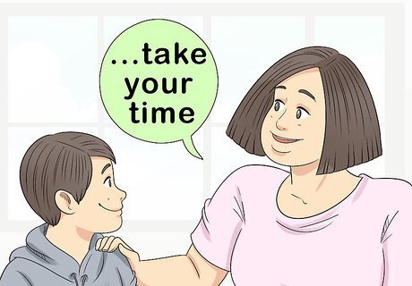 Let your child talk about the situation at their own pace. Your child might not react right away or tell you that they feel fine about the divorce. Try not to force them to talk about the situation or to react according to your expectations. Give them space, and reassure them that they can talk about their feelings when they're ready. Say, “It's okay if you feel sad, afraid, angry, or have any other emotions. You don't have to hide your feelings. I know this is a lot to process, so take your time. I'm here whenever you want to talk about it.”
