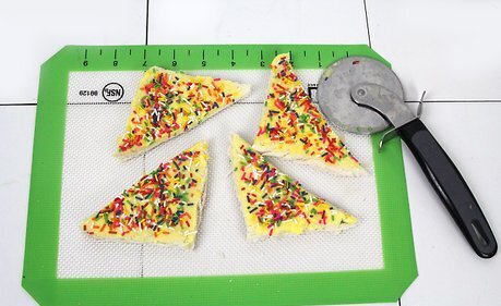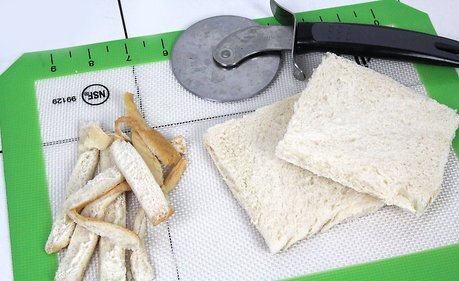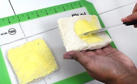 Cut the bread into triangles. It is traditional to slice each piece of bread in half, into two equally-sized triangles. However, feel free to get creative and use any shape you want. Try hewing the bread into circles, hearts, stars, or any other shape that catches your fancy. Use cookie cutters for any easy job, or design your own shapes with a sharp knife.