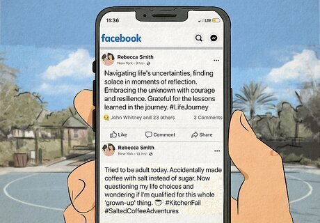 Show off your personality and don’t be afraid to be quirky or funny. Don’t be afraid to show your wackier side on Facebook. After all, the idea is to let people get to know you better and an easy way to do this is to express your thoughts and emotions in an honest way. In fact, posts about personal journeys, stories, or just a funny thing that happened to you that day tend to get some of the highest likes and comments. Of course, keep in mind the too much information rule and try to share things you would want to tell a casual friend or the general public. Don’t overstep the comfort level of others, and if you do decide to TMI, be prepared to lose some Facebook friends!