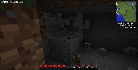 Once you've created your tools, immediately start mining in a nearby cave. However, if a cave is not available at the moment, stick with the infamous "dig down" technique. Your top priority is to mine thirteen cobblestone. If you happen to find coal or iron, remember its location for later.