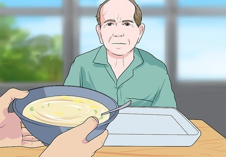 Remind them they need to eat. While early stage patients might remember that they need to eat, middle and late stage patients will not. In fact, middle and late stage patients may insist that they’re not hungry or that they already ate. When dinner comes around, politely and calmly remind the person that they need to eat. Say something like, “Margaret, I made one of your favorite meals, would you like to join me?” If you can't be present for meals, set an alarm to go off at dinner time. Make sure to put a note on the alarm reminding the person to eat when it goes off. Also, post notes on the refrigerator, microwave, and anywhere else relevant to the meal. You may need to bring middle and late stage patients to the dinner stable, or if they can't move, you may need to bring the food to them. Set an alarm to go off at meal time. It will remind you and them of meal time.