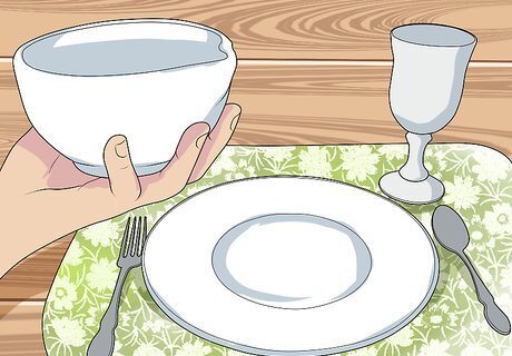 Remove unnecessary items from table. By removing unneeded items from the dining table, you'll help create an environment that is as streamlined as possible. As a result, your meal time will be more smooth and less complicated. Only place utensils the person will use, such as a fork or spoon. If you are cutting the patient's food for them, do not provide them with a knife. Remove decorative pieces, such as flowers, from the table. Avoid placing large dishes of food on the table, especially if the person is a middle or late stage patient.