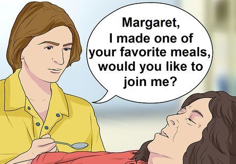 Sit with them. Depending on the condition of the person, you may also need to sit with them. This is because they might get side-tracked and may never finish. At the same time, you’ll be able to spend quality time with the person and help stimulate their brain. Eat at the same time as the person. If you don’t eat with them, use the time to talk to them or to clean up the area where they’re eating. Invite the person to join you and your family for meals, if the person is a friend or relative.