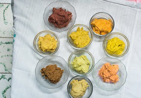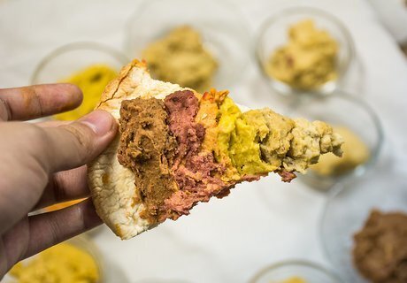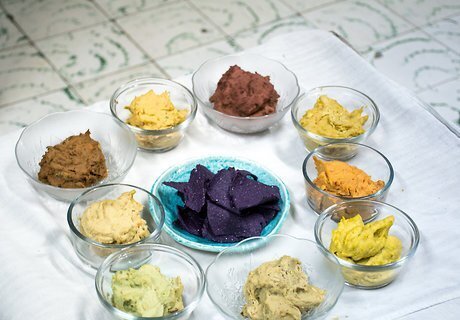 Put each hummus in a separate bowl. Once you have finished making the hummus, put each hummus into a small bowl. Arrange the bowls in a circle. You can also put them into a straight line.
