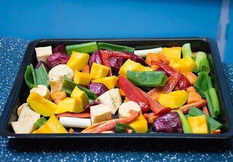 Roast the vegetables. Preheat the oven to 350°F (180°C). Put the beetroot, butternut squash, bell pepper, leek, carrots, and sweet potatoes onto a tray. They should all be able to fit on one cooking tray. Cook them for 30 minutes.