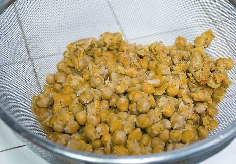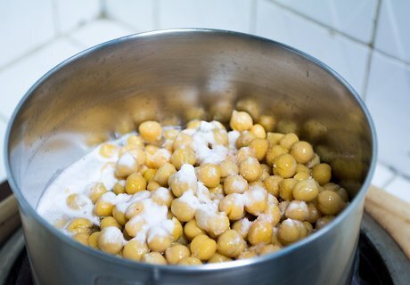 Cook the chickpeas in a 4-quart pot. Put the chickpeas in a 4-quart pot, and cover them in two inches (5.1 cm) of water. Add in one tablespoon (17 g) of salt and one tablespoon (14 g) of baking soda. Bring the water to a boil over high heat. Reduce the heat when the water begins to boil. Cook the chickpeas for 45 to 50 minutes.