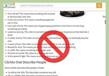Avoid clichés. Clichés are overused literary elements, which can often make works seem boring and tire the reader. Since the reader has already seen the same cliché so many times, they most likely won't like the poem and will have read lots just like it. Clichés: Work against original communication and people value creative talent. They want to see work that isn't the normal thing they see every day. When they see a work without clichés, they know the writer has worked hard doing whatever it takes to be original. When they see a work full to the brim with clichés, they feel that the writer is not showing them anything above the ordinary and didn't put that much effort into it. Dull meaning. Because clichéd writing sounds so familiar, people can and often do skim through lines. If they don't bother to read your poem all the way through, they certainly won't stop to think about it. If they do not stop to think about your poem, they will never encounter deeper meanings and emotion.