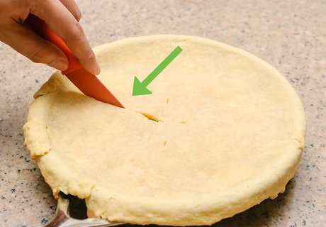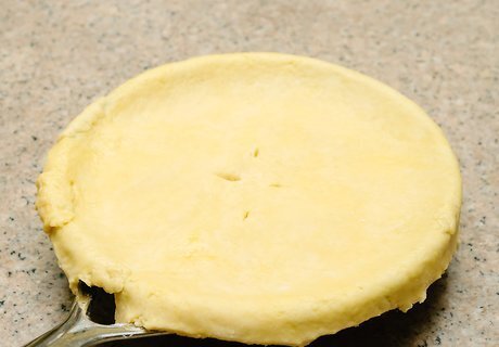 Lay your pastry over the top of the skillet and filling. The final step in making your pot pie is to take your pastry material and lay it completely over the top of the skillet. Take care when doing this, as the pastry top is the signature characteristic of the skillet chicken pot pie. The pastry material will cover the filling and go over the edges of the skillet. With a knife, cut 4 to 6 slits in the crust so that the pie will be able to vent heat.