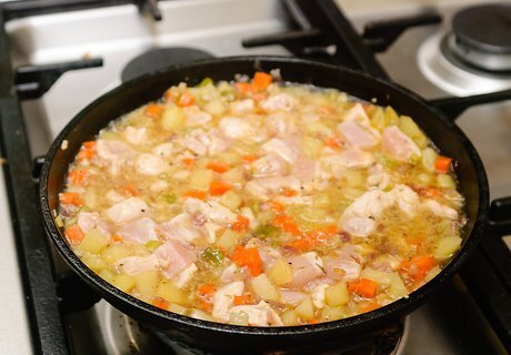 Pour in broth. After adding your vegetables and spices, it’ll be time to pour broth in. The broth will add moisture and flavor to your pot pie, so make sure you add the appropriate amount for your pie. Pour in half a cup of broth at a time. Taste and then add an appropriate amount of salt. Bring to a boil and then reduce heat to a simmer. Add chicken after reducing heat. Wait 8 to 10 minutes before moving on.
