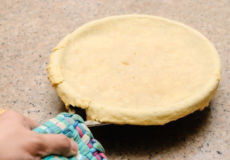 Remove your pot pie. Finally, you’ll be able to remove your pot pie from the oven. However, you need to make sure your pie has cooked properly, for the right amount of time, and at the proper temperature. Verify that the temperature is still at 375 degrees. Remove your pie once the pastry top is golden brown. Allow your pie to sit and cool off for about 10 to 15 minutes after removing it from the oven.