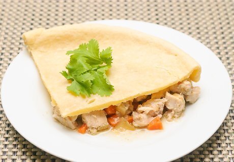 Serve your pot pie. Serving your pot pie is also a relatively tricky endeavor, since there is no bottom crust to hold the pie together. As a result, you'll have to do a little extra work to provide a unique dining experience. Cut the crust with a bread knife. Use a pie server to remove the crust and place it on a small plate. Take a large serving spoon to scoop out the pie filling and place it a large serving plate. Relocate the pie crust from the small plate to on top of the pie filling. Consider serving your pot pie with a fruit salad, sweet potatoes, or green vegetables like brussels sprouts, broccoli, or green beans. Think about garnishing your pot pie with fresh parsley or rosemary.