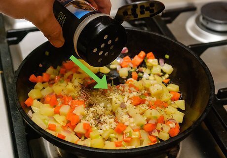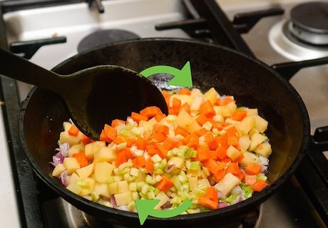 Put in your vegetables, after your oil has heated up. When putting in your vegetables, you want to make sure to put them in deliberately and to time which ones you put in first. Make sure to: Put your onions and green peppers in first. Allow them to cook for a minute or two before adding anything else. Place your carrots and celery in next. Drop the rest of the vegetables in. Wait 2-4 minutes before adding anything else.