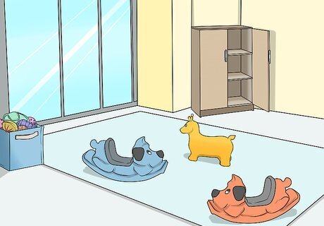 Hide wires when possible. Wires are both a tripping and hanging hazard, so try to hide them away in cabinets. You can also use wire guards, which hold the wires down to the carpet or you can hold wires to the walls with adhesive hooks. Plus, hiding the wires away helps the room look less cluttered. It's also a good idea to replace your outlets with the kind that have a sliding cover. That way, your child can't stick anything in the outlets.