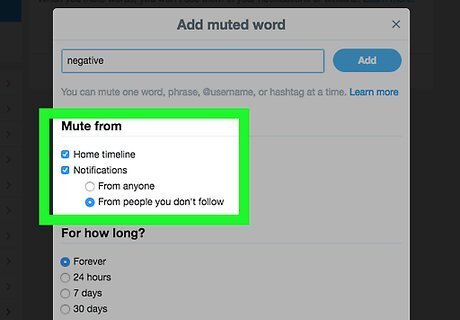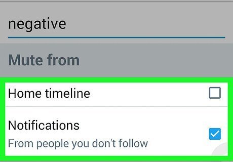 Pick whether you want to mute the word on your Home timeline or Notifications, or both. Select the checkbox for each, as desired.