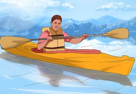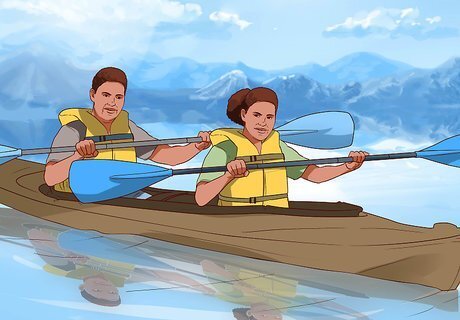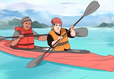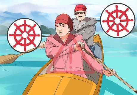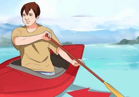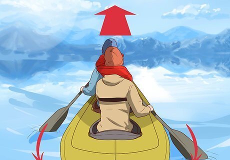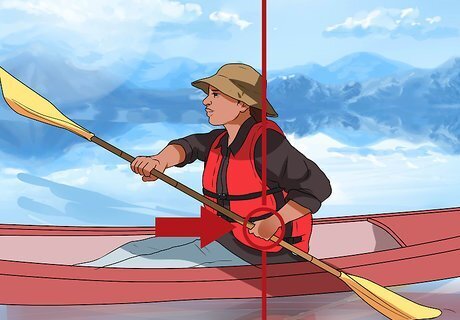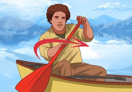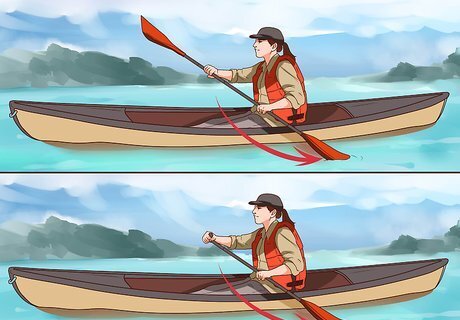 Switch the side you paddle on every few strokes. If you've ever seen someone paddle in a canoe, you've probably noticed that she will pull the paddle out of the water every few strokes and start paddling on the opposite side. This is to keep the canoe going in a straight line — paddle on only one side and you'll notice yourself start to turn to the side opposite your paddle. To cross, pull the paddle out of the water when it is at your hip. Lift it perpendicular to the boat and bring it across while switching the position of the top and bottom hands — this should feel natural. Insert it into the water and paddle as before. Try practicing this a few times to get a feel for the "rhythm" of when to switch sides. For most, switching after every few strokes is best — the exact number will vary depending on your paddling form and how hard your strokes are. If you're paddling tandem (i.e., with two people in the canoe), you'll want to coordinate the switch with your partner. See below for information on paddling with a partner.