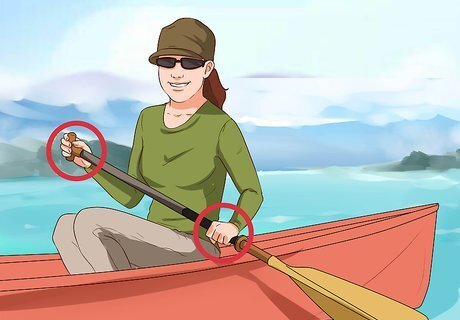 Grip the paddle with one hand on top and the other a few feet down. Seated securely in the boat, grab a paddle with both hands. Put one hand on top of the end of the handle (there should usually be a rounded portion here; if there isn't, grip the handle near the top.) This will be referred to as your boat-side hand. Use your other hand to grab a lower point on the handle that's comfortable for you. Usually, this will be at least a foot or so above the flat part of the paddle — gripping right next to the flat part isn't advised as it forces you to work harder. Turn your hand so that your lower palm is facing toward the boat. This will be referred to as your water-side hand.