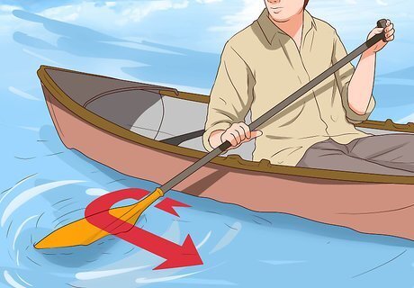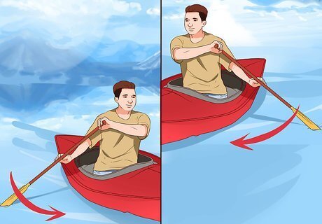 Use "J" strokes for more controlled turns. While canoeing, you'll eventually find that, while paddling on one side of the boat is an effective way of steering in many situations, there are plenty of times when quicker turns are required. One of the simplest ways to turn is called a J stroke. To use this technique, you'll ideally want to be sitting in the stern of the boat. To do a J stroke, put your paddle into the water behind you so that it is nearly flat against the side of the boat, which it should be almost touching. As you do this, twist your torso so that your shoulders point parallel to the sides of the boat. Use your core and torso muscles to turn back to a forward-facing position — this should make the paddle turn out to the side a little and the boat should turn to the same side as the paddle is on, just like if you were using a rudder. Avoid over-using this stroke. While it will make you turn quickly, it will also slow down your forward momentum.