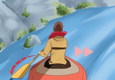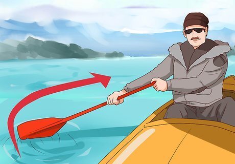 Use large back sweeps for sharp turns. The J stroke discussed above is actually just a smaller version of a special paddle technique called a "back sweep." By increasing the size of the back sweep, you'll increase the speed at which you turn. However, larger back sweeps will also make you slow down more, so you'll want to reserve them for situations when you need them or you'll have to paddle hard to build up speed again. To do a back sweep, start out with your paddle behind you as you would for the J stroke. This time, as you straighten your torso, let the paddle swing out completely to the side — it should be perpendicular to the side of the boat when you finish the motion. You should immediately notice the boat turn to the same side as the paddle is on.