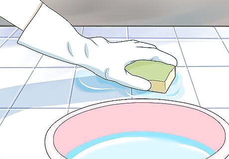 Use a wet sponge to remove the abrasive bathroom cleaner. Soak a sponge in water once you've finished removing dirt and other stains from the tiles. Gently wipe the bathroom cleaner from the tile. Make sure you remove any other residue left on the tile.