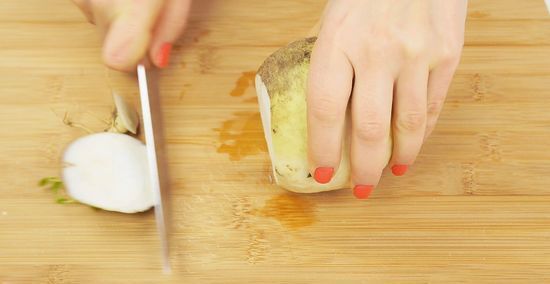 Remove the top and bottom and cut the rutabaga in half. Place your rutabaga on a cutting board. Using a sharp knife, remove the hard top and hard bottom of the vegetable. Discard these pieces. Then slice the entire rutabaga in half lengthwise.