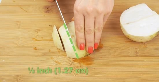 Cut each half into ½ inch (1.27 cm) semi-circles. Lying one half of the rutabaga on its flat side, carefully slice it into about ½ inch (1.27 cm) semi-circles. Repeat this process with the other half.