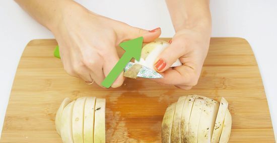 Remove the outer skin with a paring knife. Pick up one slice of rutabaga and hold it in your non-dominant hand. Then, take out a paring knife and hold it in your dominant hand. Place the edge of your knife against the rutabaga, facing toward you, and apply pressure to the rutabaga with your thumb. Slide the knife along the rutabaga slice toward you, removing the skin. Discard the skin and repeat with the remaining slices. The outer skin of the rutabaga is thick and tough. For this reason, a traditional vegetable peeler may not work and a paring knife is recommended.