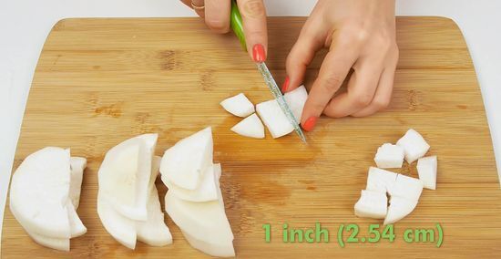 Cut each piece into 1 inch (2.54 cm) cubes. With the skin removed, you can now chop your rutabaga. Whether you will be boiling, roasting, or baking this vegetable, you will most likely need it to be in cubes. Take out your sharp knife and cut each slice into 1 inch (2.54 cm) cubes. Repeat with the remaining slices.