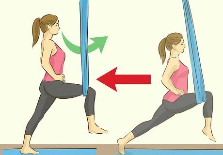 Rock back to starting position when exhaling. Once you’ve leaned forward into lunge position, you should exhale and apply pressure to the hammock with your right leg. This will push you back into the starting position so that you can repeat the aerial lunge again. Once you’ve repeated this move several times, switch legs and do lunges with the left leg in the hammock.