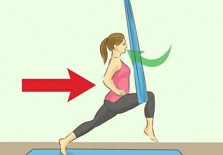 Stand in the center of your mat and separate the sides of the swing. From this position, you can begin to do some of the most basic aerial yoga moves, such as the aerial lunge. You should be standing close enough to the swing that your face touches or almost touches the fabric, and the bottom of the swing’s “U” should hit at pubic bone level. If the swing hits higher or lower than your pubic bone, you should adjust it before mounting the swing. The aerial lunge improves quad strength and stretches out your hip flexors.