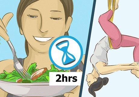 Be mindful of food and drink. Like regular yoga, aerial yoga can put a lot of pressure on unaccustomed body parts and cause your body to release gas. In order to avoid an upset stomach or uncomfortable gassiness, stay away from fizzy drinks for at least 2 hours before your session. For similar reasons, you’ll probably want to wait at least 2 hours after eating to begin your session.