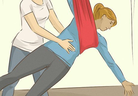 Have a spotter or yoga buddy practice with you. Once you’re a seasoned yoga flyer, you can do your workouts alone. In the meantime, though, you should always practice aerial yoga with someone else. At the very least, have someone in the room so that they can assist if you fall or find yourself in a precarious position. That being said, don’t be afraid of the yoga swing! For most moves, you’ll actually only be about 3 inches (7.6 cm) from the ground, so even if you fall off, you won’t have far to go.