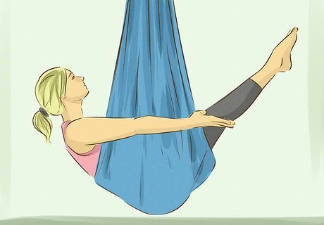Try out slightly more complicated moves, such as the half boat pose. Once you’ve got the basic aerial lunge down, you can move on to other fundamental and generally accessible poses. The half boat pose, for example, requires you to rest your lower back in the hammock, lean back, and lift your legs. Hold the pose for 5 seconds to engage your core and develop core strength and awareness. Other basic aerial poses to try are child’s pose and downward facing dog. For further guidance, check out online video tutorials.