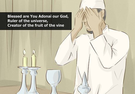 Recite the prayer over the wine. Wine represents hope and joy for a happy week ahead. Pray the following: ברוך אתה יי אלוהינו מלך העולם בורא פרי הגפן The transliteration is: Baruch ata Adonai eloheynu melech ha’olam borei p’ri hagafen. Translate this as: Blessed are You Adonai our God, Ruler of the universe, Creator of the fruit of the vine.