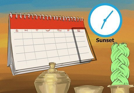 Start Havdalah after sunset on Saturday. The service should not begin before sundown, and the traditional timing is to wait until three medium sized stars can be viewed in a single glance at the sky. There are, however, other means of determining when to start: Some people start Havdalah one hour and ten minutes later than they began Shabbat. So, if Shabbat began at 6:00 PM on Friday, Havdalah would begin at 7:10 PM on Saturday. Others base the start time on sunset in their location, and add approximately forty-five minutes. So, if that day’s recognized sunset time is 7:13 PM, Havdalah would begin just before 8:00 PM. There are online and printed guides available to help you time out when to begin Havdalah. You can also ask around regarding the traditional start time determination where you live.