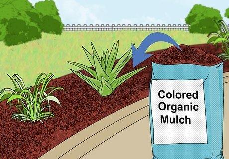 Try organic mulch covered with vegetable dyes. If your mulching priorities include adding color to your garden bed, as well as slowing weed growth, improving soil quality and water absorption, you should choose a colored organic mulch. This type of mulch will add a nice earthy red, brown or other color to your garden, as well as a nice, soft texture. It is easier to spread this mulch around plants because of the fine texture, in contrast to wood chips or shredded wood. The dye will fade eventually, so you will need to add another layer at the start of the next gardening season.