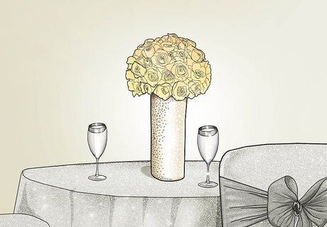 Go for sparkly, snow-related decorations. Incorporate snow into your decorations. Pick light white, gray, and ivory decorations that sparkle a little. This will remind guests of snow, which is often a staple of the Christmas season. Have glittery white vases holding flowers as the centerpiece of each table. Use sparkly gray or white tablecloths for tables at the reception. Crystal can also have a snow-like feel, so opt for crystal glasses, plates, and silverware during the reception.