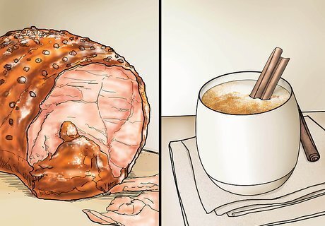 Choose Christmas-related foods and beverages. When choosing food and drinks, go with a Christmas theme. For the main course, pick a version of a traditional Christmas dinner. You could, for example, serve some kind of roast carvery style. For example, have guests have slices of a baked ham for dinner. If you're serving alcohol, pick Christmas-themed cocktails like mulled wine and spiked eggnog. Keep your desserts in the spirit of the season with a Christmas-Themed Wedding Cake. For other desserts, choose flavors people associate with Christmas, such as nutmeg and peppermint.