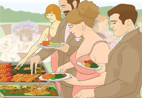 Have a less formal reception. Traditionally a reception serves a sit down dinner. Rather than pay the expense for catering, consider a less formal option for your reception. You could have a buffet style reception or have a breakfast or lunch reception earlier in the day. This will cut down on the food cost for your wedding.