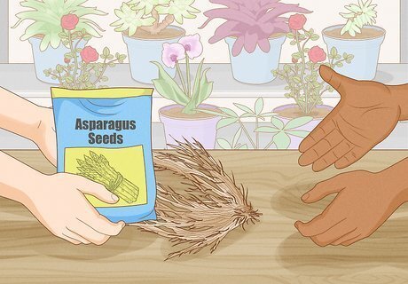 Buy asparagus seeds or crowns. Asparagus seeds and crowns can be purchased at home and garden stores, nurseries or online. Seeds are available all year round, but crowns are usually for sale very early in the spring, right before they should be planted. Asparagus plants are monoecious, meaning that each plant is either male or female. The female plants put energy into producing seeds, so they don't produce as many spears as the males. Some varieties of asparagus have been engineered to produce only male plants. You only need to plant half as many crowns of a male-only variety to get the same yield, since you won't need to weed out the female plants. Asparagus seeds aren't usually separated by sex, so the female plants are weeded out once they sprout. Choose a rust-resistant variety, such as one of the many "Jersey" varieties or a "Mary Washington." If you're buying crowns, pick healthy-looking crowns that are a grayish-brown color, large and plump. Buy them just a day or so before planting them. Purple asparagus and other heirloom varieties are available at nurseries. You can create white asparagus by shielding the spears from the sun with soil.