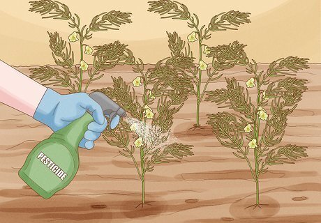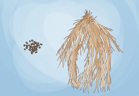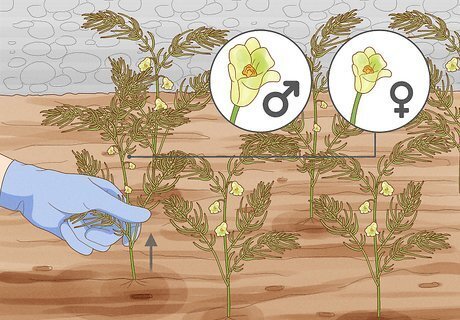 Weed out the female plants. When the plants begin producing flowers, you'll be able to tell which are male and which are female. The male plants have large, long flowers, and the females have smaller flowers. Pull up the female plants and compost them.