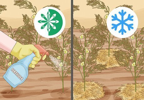 Fertilize and mulch the plants. In spring, fertilize the asparagus plants with a liquid fertilizer meant to stimulate growth. During the winter, protect the plants from the cold by covering them with straw or another mulch.