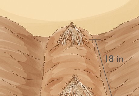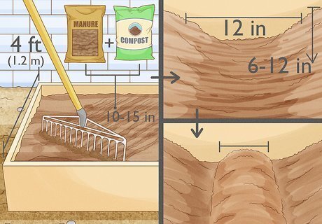 Prepare the bed. Prepare a bed 4 feet (1.2 m) wide. Remove all traces of weeds and grass from the bed, making sure there are no roots left behind in the soil. Till the soil and rake in manure, compost, blood or bone meal at a depth of 10 to 15 inches (25 to 38 cm). Dig trenches for planting. Trenches should be 6 to 12 inches (15 to 30 cm) deep and around 12 inches (30 cm) wide. If you are planting multiple rows, space the trenches 2 to 3 feet (0.6 to 0.9 m) apart. Make ridges in the trenches. Mix the soil that you removed from the trenches with organic compost, and spread 2 to 3 inches (5 to 7 cm) of the enriched soil into the bottom center of each trench to form a center ridge. You can also mix in rock phosphate, a mineral powder that encourages root growth.
