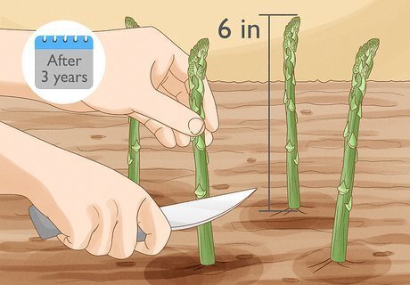 Pick the spears. After three years, or two if you started the asparagus from crowns, it's time to enjoy your harvest. Cut the spears every few days using a sharp knife or scissors. As your plants produce more spears, you may have to harvest them more often. Spears are ready to be harvested when they are about 6 inches (15 cm) high, and the tips begin to loosen. Limit the first harvest to two or three weeks, picking spears every few days, and taking care not to pick too many from the same plant. Spears will come up thinner the longer you harvest. A good rule of thumb is to stop harvesting once the spears are about the size of a pencil, allowing the plant to devote energy to its root systems from then on. The following year, extend your harvest time to four or five weeks. In the succeeding years, you can extend it to six.