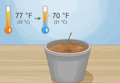 Lower the temperature when the seeds sprout. Once they have sprouted, they do not need to be kept as warm. Lower the temperature to 70 °F (21 °C).