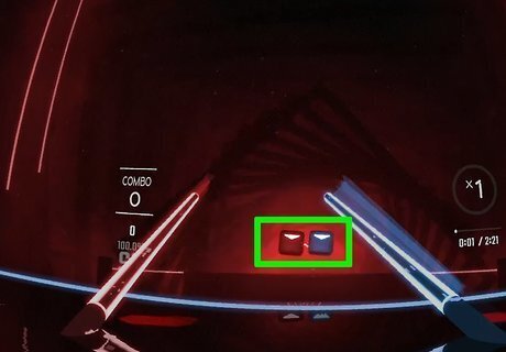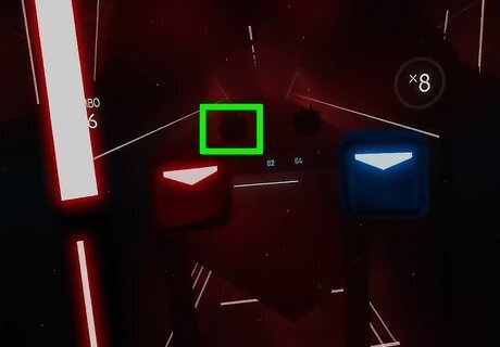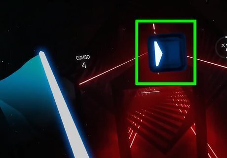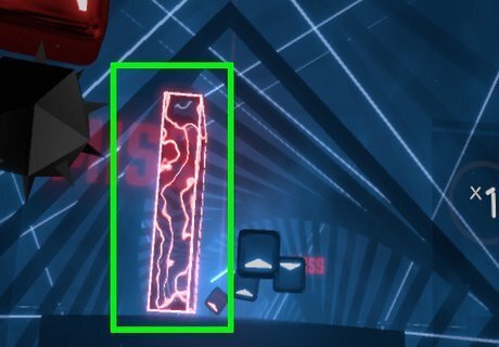 Avoid obstacles. Move your head so that walls coming at you will not hit you. Keep on slashing blocks while doing this. Your saber can pass through obstacles, and you will feel a vibration when they are in one.
