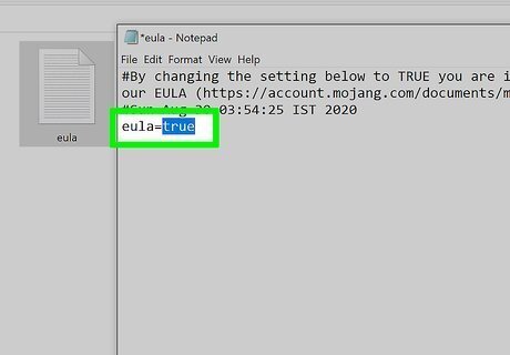 Change .eula=fasse to eula=true. Open .eula.txt. You can find this file in your Minecraft Server folder. Save the changes to the file and close it. Doing this accepts the terms and conditions for the Minecraft server program.
