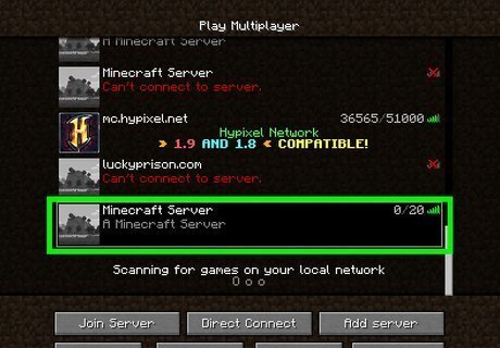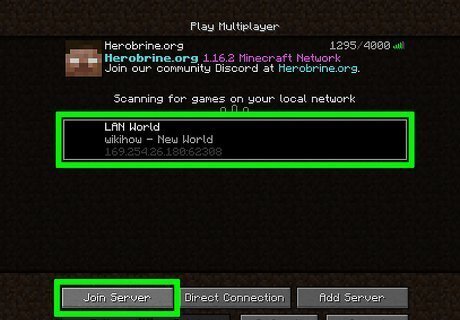 Start Minecraft on the second computer, then click Multiplayer. Make sure that the computer is connected to the network, and that it is running the same version of Minecraft that the host computer is running.Minecraft will scan your network for any active games. The host computer Minecraft game should appear on the list. If the game doesn't appear, click the Direct Connect button and then enter the local IP address for the host computer.