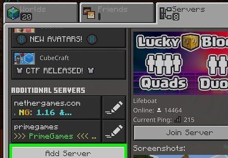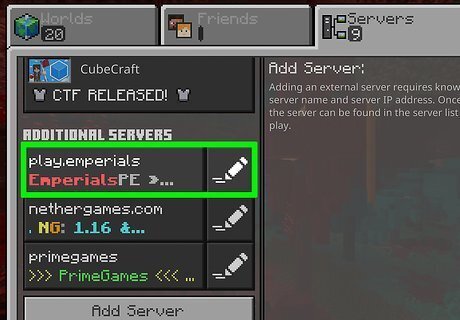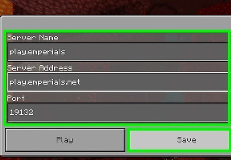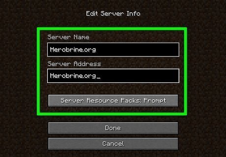 Click the "Add server" button and paste the IP address. Enter in a name into the "Server Name" field. This can be anything, but entering the actual name of the server will help you identify it when you want to play it later on. Click "Done" to save the server information. Your newly-added server will appear on your list of games. If the server doesn't appear, make sure that you've entered the Server Address correctly.
