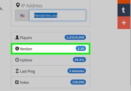Check the server's game version. Servers often run on older versions of Minecraft, as it takes a while for server tools to get upgraded to newer versions. Take note of the version of Minecraft that the server is running to make sure it’s compatible with what you’re using. You can find the game version in the description of the server. If you need to create a new game version, head to Installations > New > versions > Create > Play.