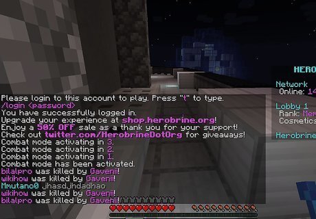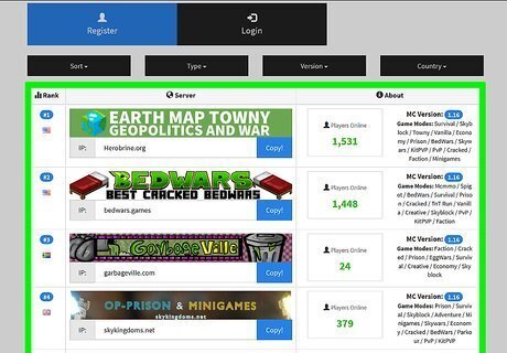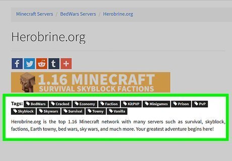 Decide what server is right for you. There are several things you'll want to pay attention to when selecting a server. Different servers offer wildly-different experiences, and most will have descriptions that you can read. Look for a few important details before picking a server to try: Game type: While many servers offer the standard Minecraft gameplay, there are lots of servers with all kinds of game modes. These range from capture the flag to in-character role-playing, so you’ll never run out of possibilities. Whitelist: If a server operates a whitelist, it only accepts users that have been registered. This usually means you'll need to create an account on the server's website in order to connect. Population: This is the number of people currently playing, as well as the maximum number of people. Keep in mind that you may not actually be playing with all of these people, since servers often split large populations onto multiple servers. PvP: This stands for "Player vs. Player", and means that players can attack each other. These can be tough servers if you're new to the game. Uptime: This is how often the server is online and available. If you plan to play online a lot, you'll want to find a server with an uptime of 95% or better.